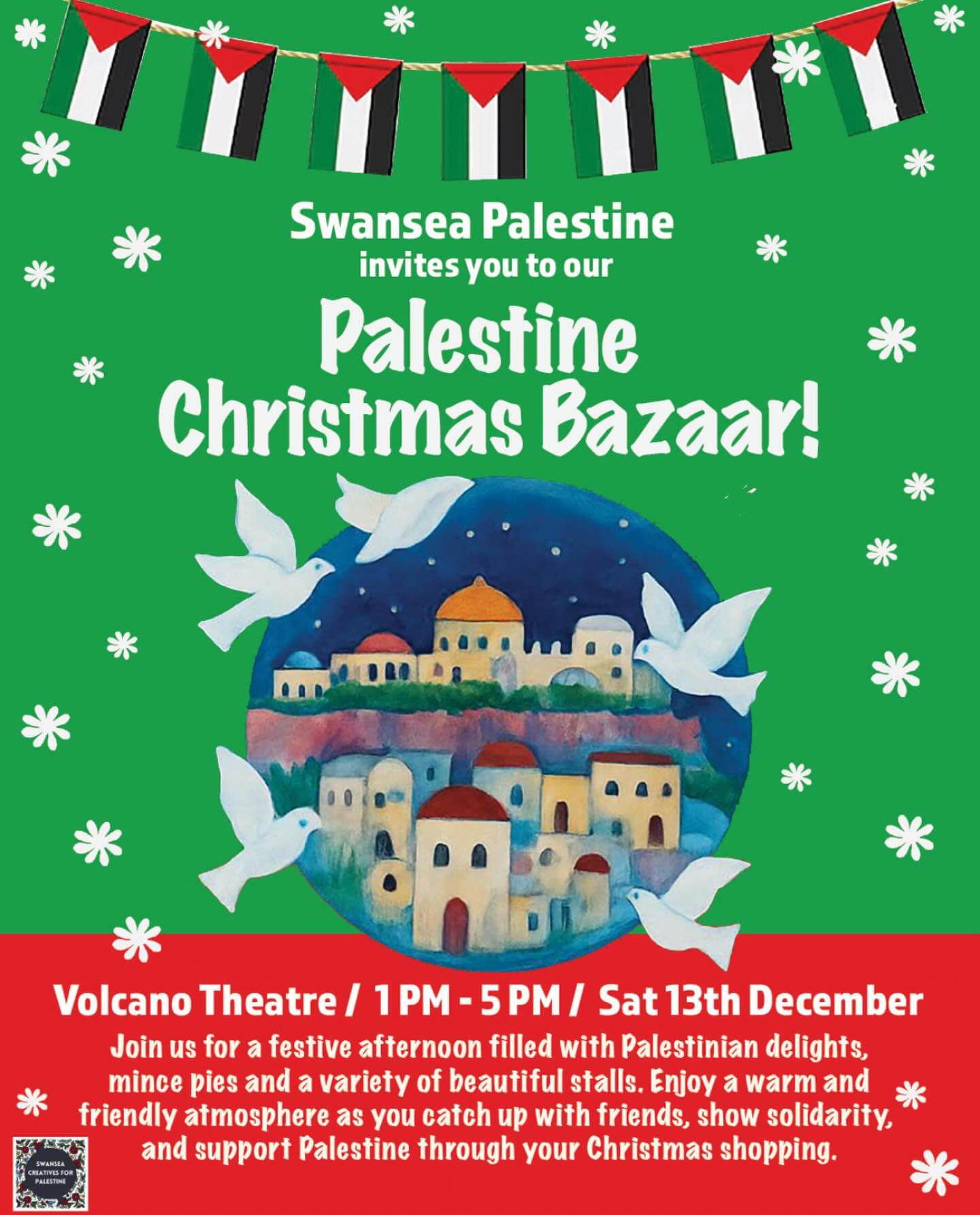 Join SWANSEA CREATIVES FOR PALESTINE for a festive afternoon filled with Palestinian delights, mince pies and a variety of beautiful stalls. Enjoy a warm and friendly atmosphere as you catch up with friends, show solidarity, and support Palestine through your Christmas shopping.